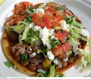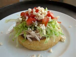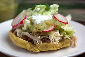 A SOPE (Spanish pronunciation: [ˈso.pe.]) is a traditional Mexican dish originating in the central and southern parts of Mexico, where it was sometimes first known as Pellizcadas. It is an Antojito which at first sight looks like an unusually thick tortilla with vegetables and meat toppings. The base is made from a circle of fried masa (ground maize soaked in lime, also used as the basis for tamales and tortillas) with pinched sides. This is then topped with refried black beans and crumbled cheese, lettuce, onions, red or green sauce (salsa, made with chiles or tomatillos respectively), and sour cream. Sometimes other ingredients (mostly meat) are also added to create different tastes and styles of Sopes. Sopes are roughly the size of a fist.