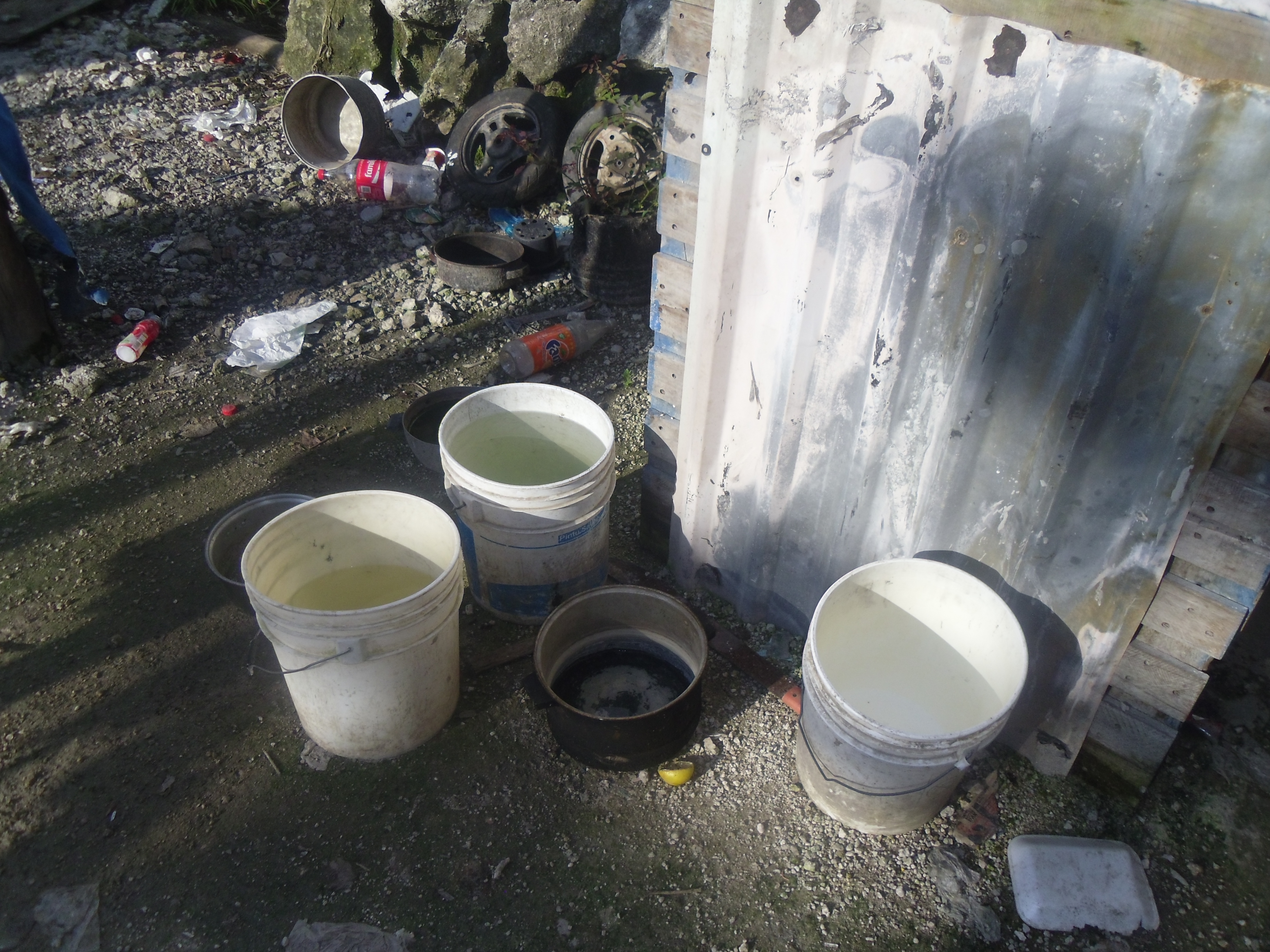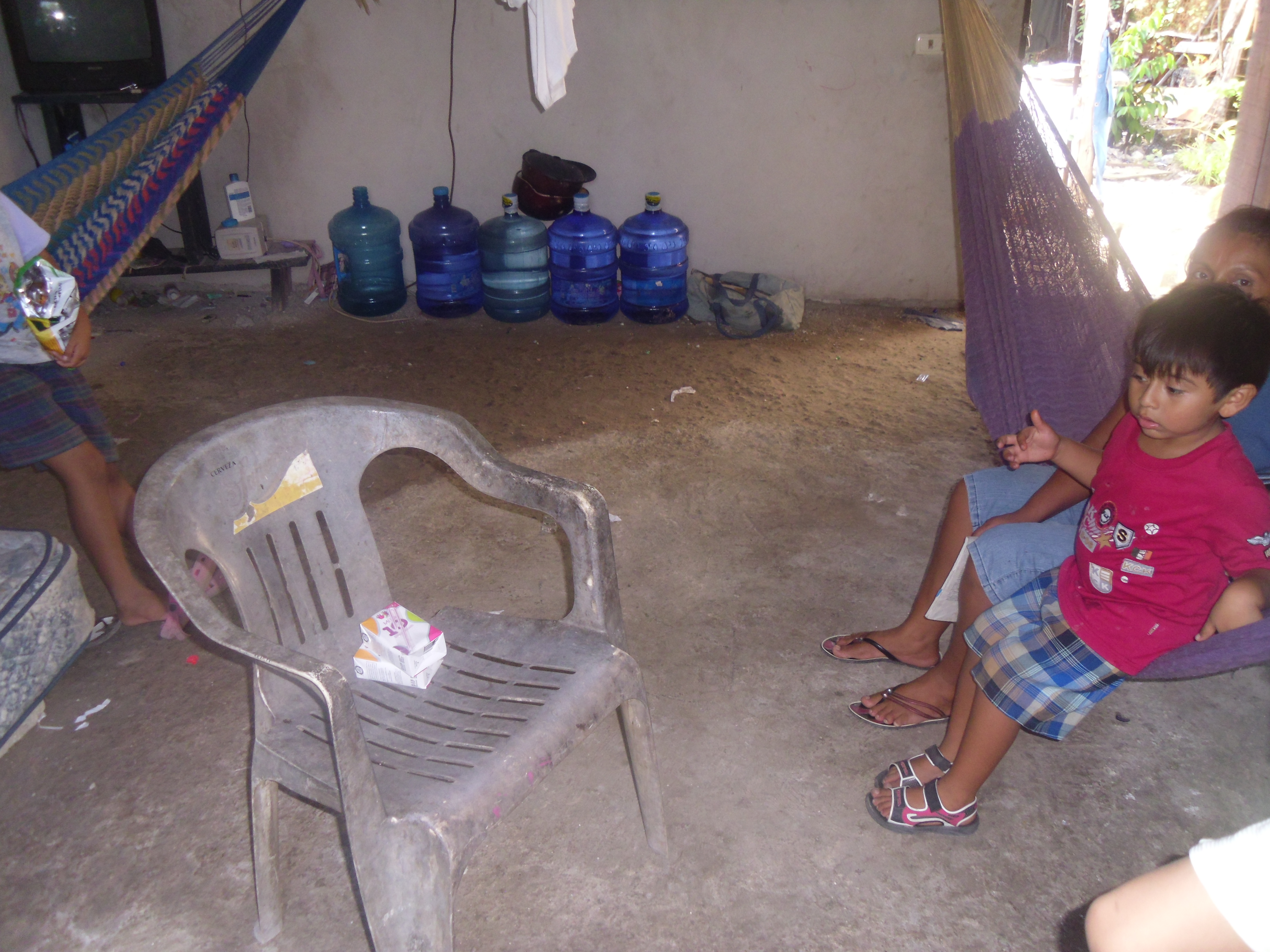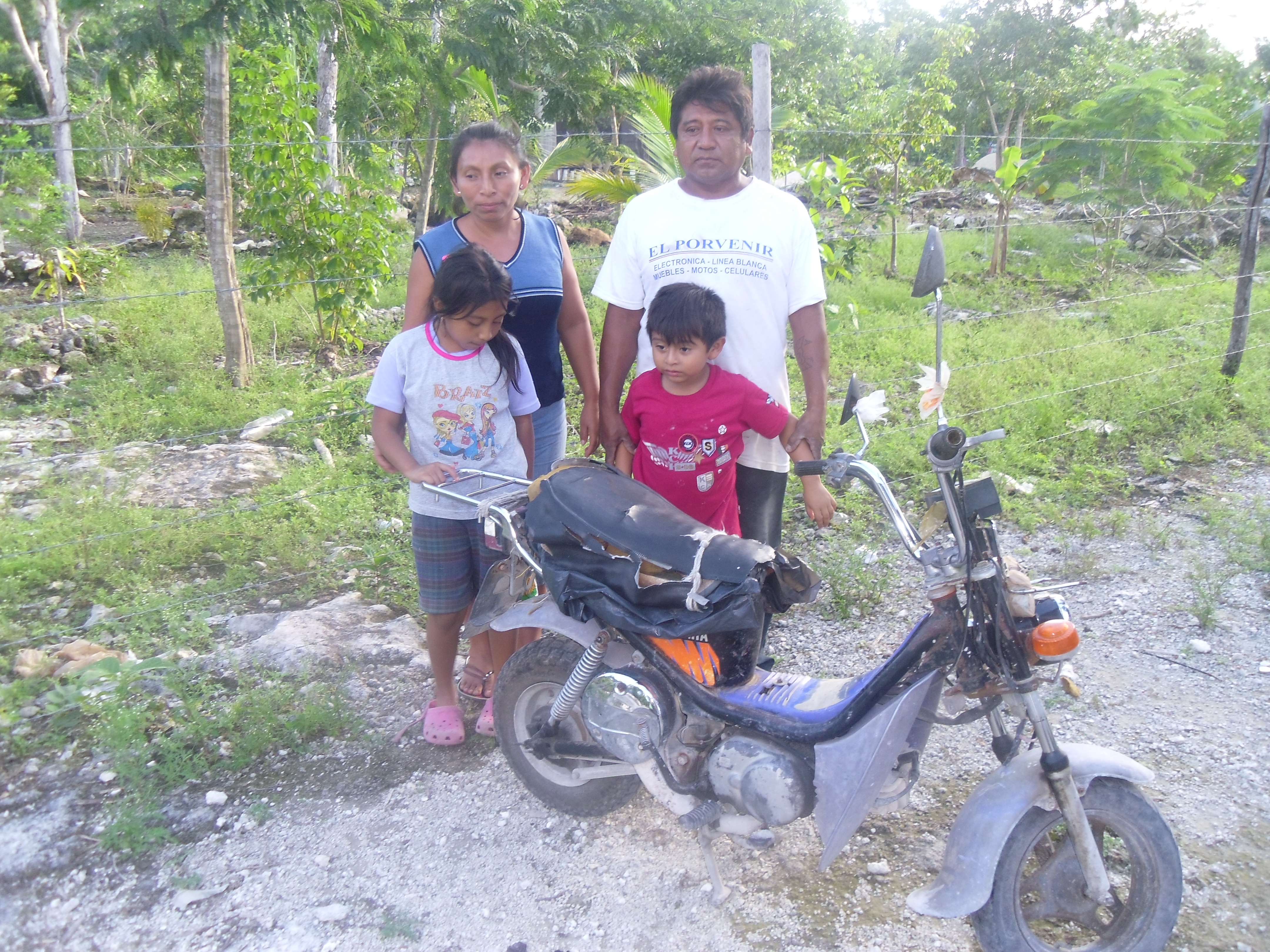 Here is their story: They had worked hard to purchase their plot of land almost to the end of Las Fincas. They built a palapa, had a stove, refrigerator and washer. Because of the bad wiring, their Palapa burned down with everything in it. They had already saved up and built a large cement room. Thankfully, at the time of the fire, they were all with the Dad working on the room. It has a roof, no doors in the doorways, an unfinished floor, no windows, or bathroom. This is where they live with one small mattress and a hammock. They cook outside with wood that they collect. It is cold there at night, and after the rains, the mosquitoes look like small helicopters. They have no screens.They raise chickens and turkeys; have a pigeon that lives in the house, a three-legged cat, and a dog for protection. The pictures are of the family, Jesus Antonio Paredes Castillo, his wife Angellica Maria Cuxium Yami, Daughter Luz Aurora Paredes Cuxium, and son Jose Ismael Paredes Cuxium in their humble surrounding. They are very short little people, the motorcycle pictured is toy size and is falling apart. The buckets in the picture is the water they get from their well.