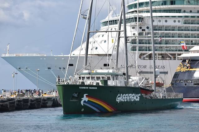 At 13:15 pm yesterday, the Rainbow Warrior berthed on the inner side of the pier “Punta Lagosta” with cruise Navigator of the Seas and Disney Wonder, calling the attention of cruise ship tourists and inhabitants of Cozumel.
