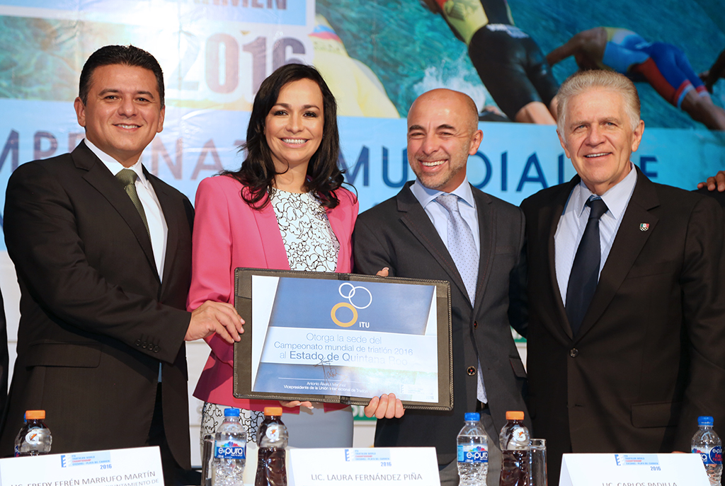 Mayor, Fredy Marrufo Martín, along with the Secretary of Tourism of Quintana Roo, Laura Fernández Piña, were part of the official press conference presentation , “3rd International Triathlon Union (ITU) World Championships Cozumel-Playa del Carmen 2016” held in Mexico City.