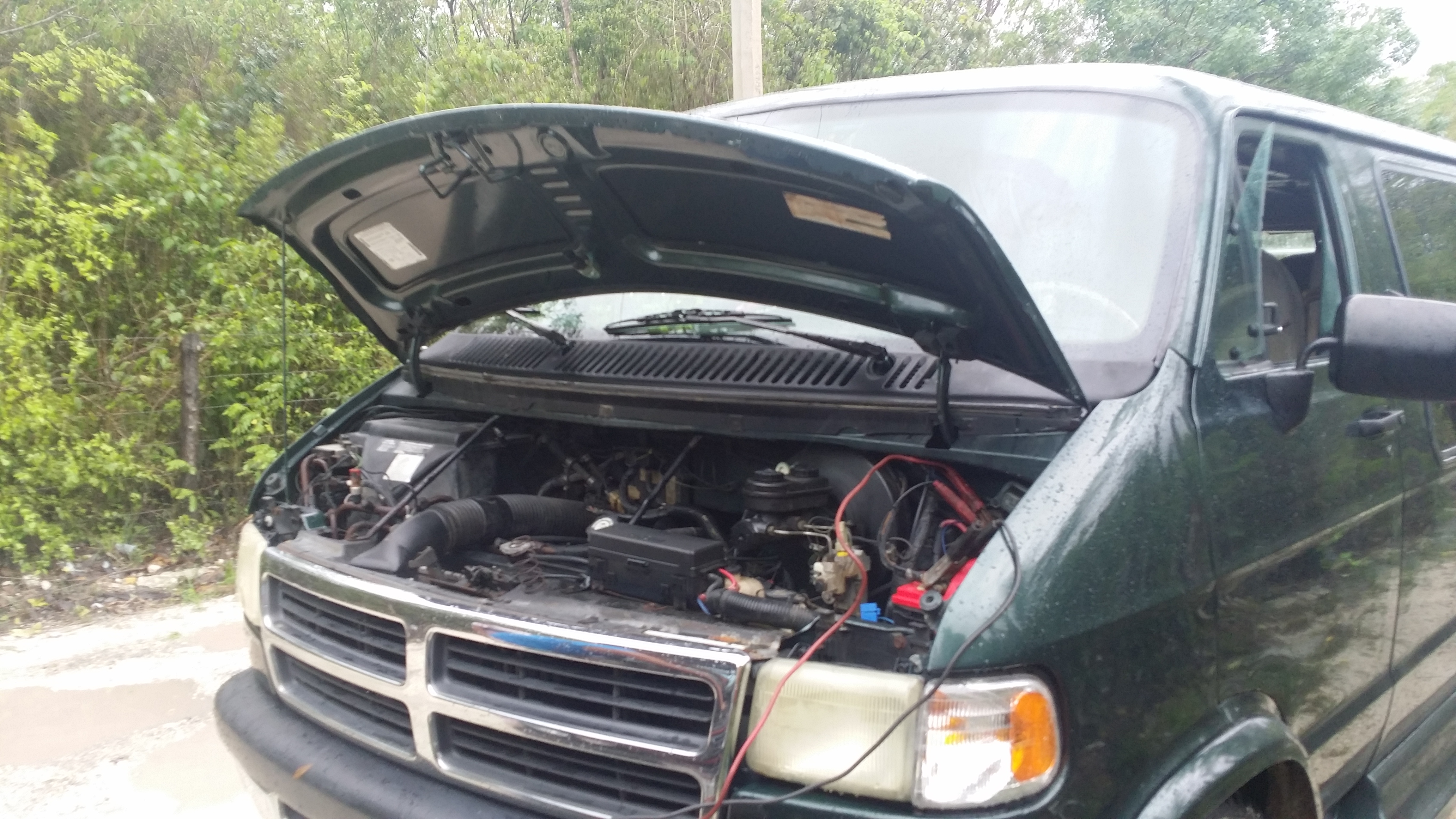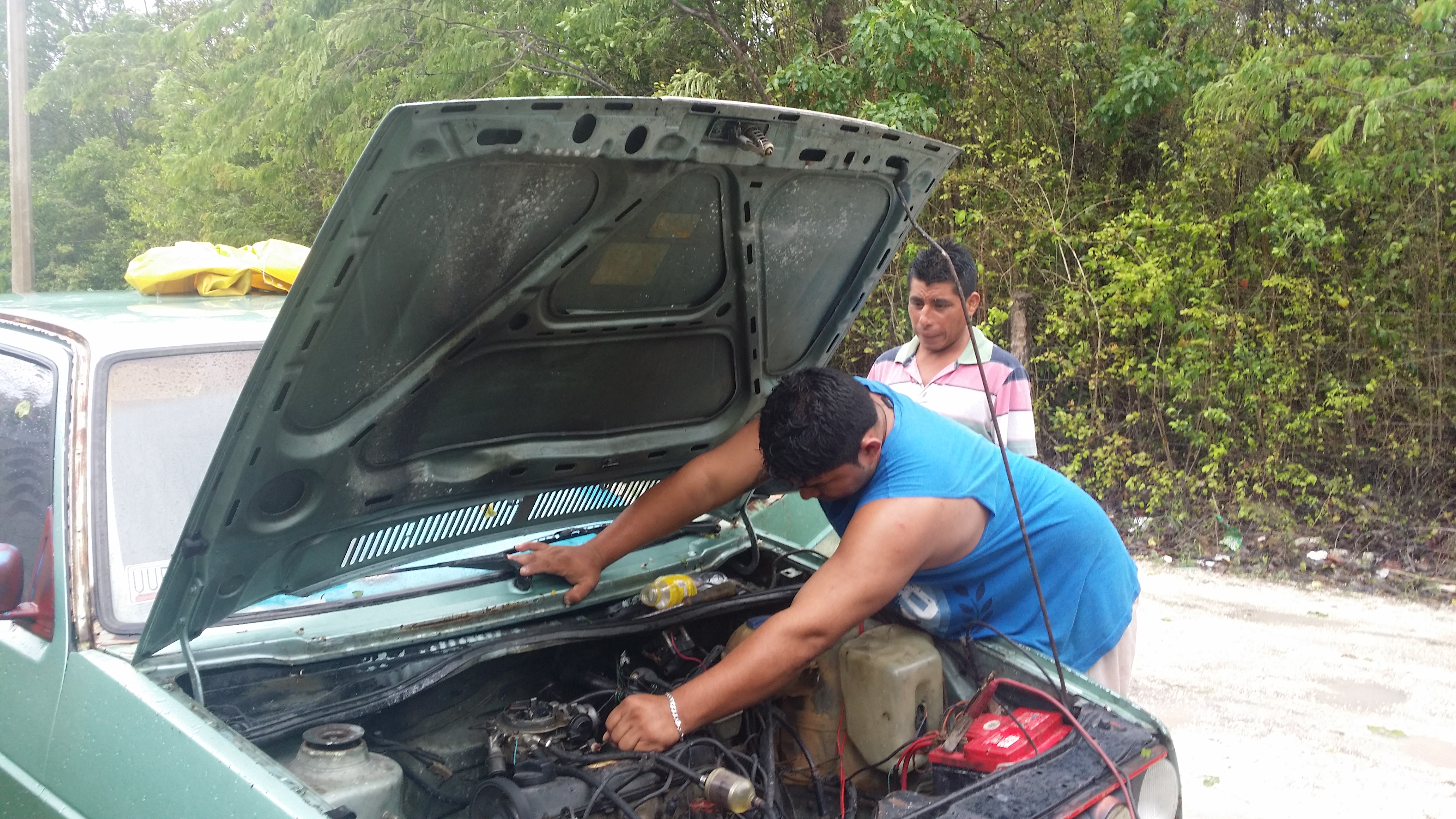 We stopped to help these two young men jump their car that had flooded on Saturday. We made it home just as a belt broke in our poor van making it difficult to steer and smoke everywhere. Thank you Lord! If it had happened in the Fincas, I do not know what we would have done!
