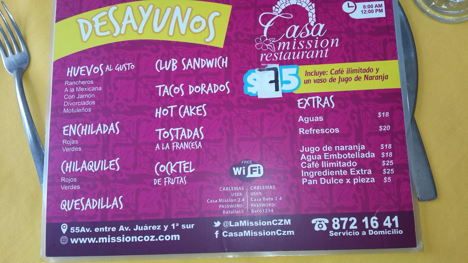The Breakfast Menu has 15 choices and includes one glass of orange juice and unlimited coffee for just $75 pesos per person.